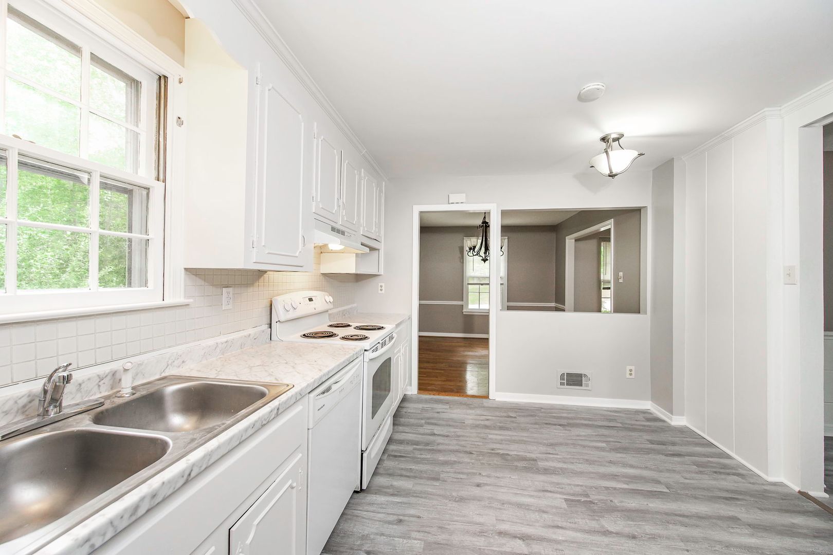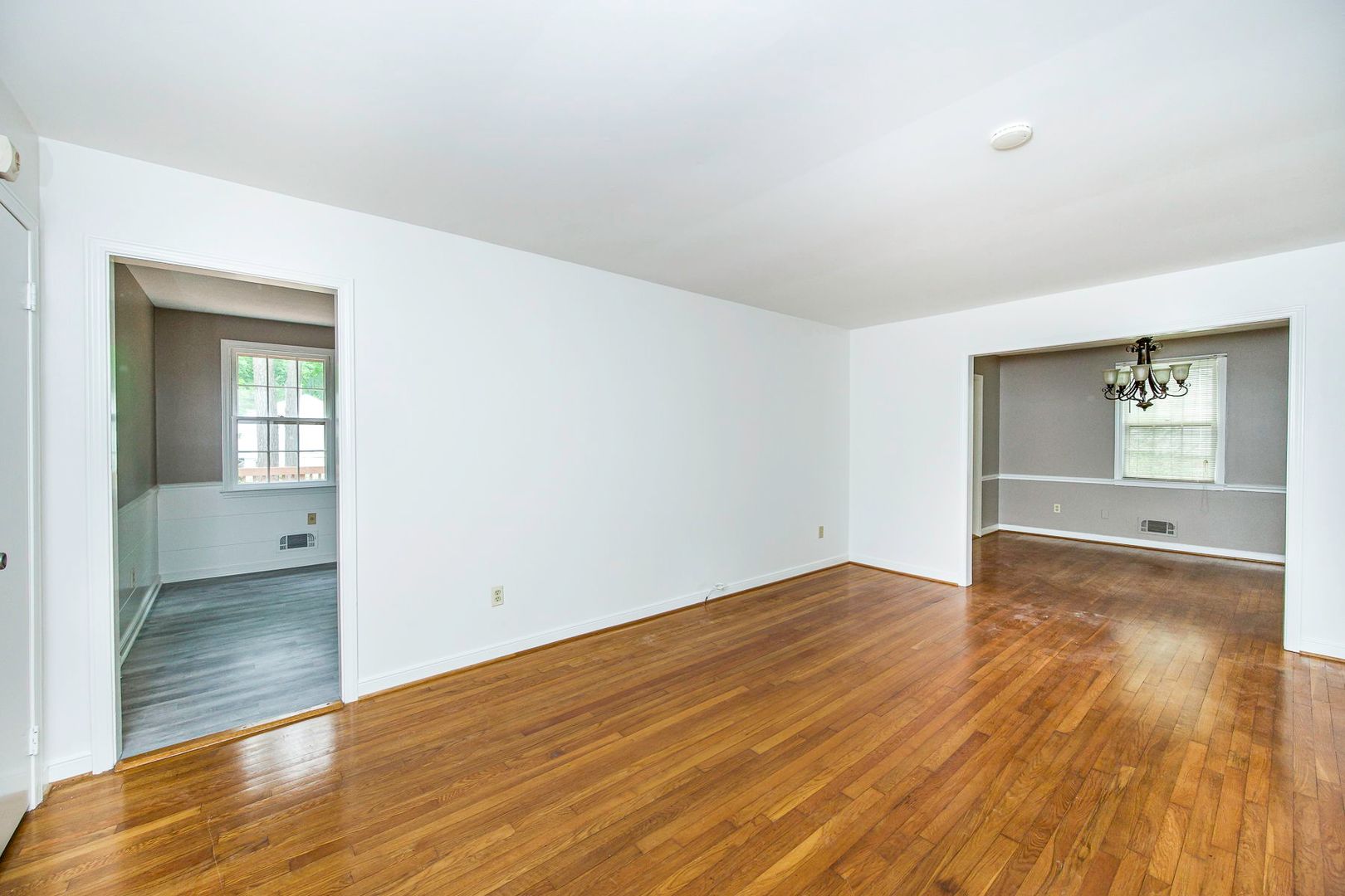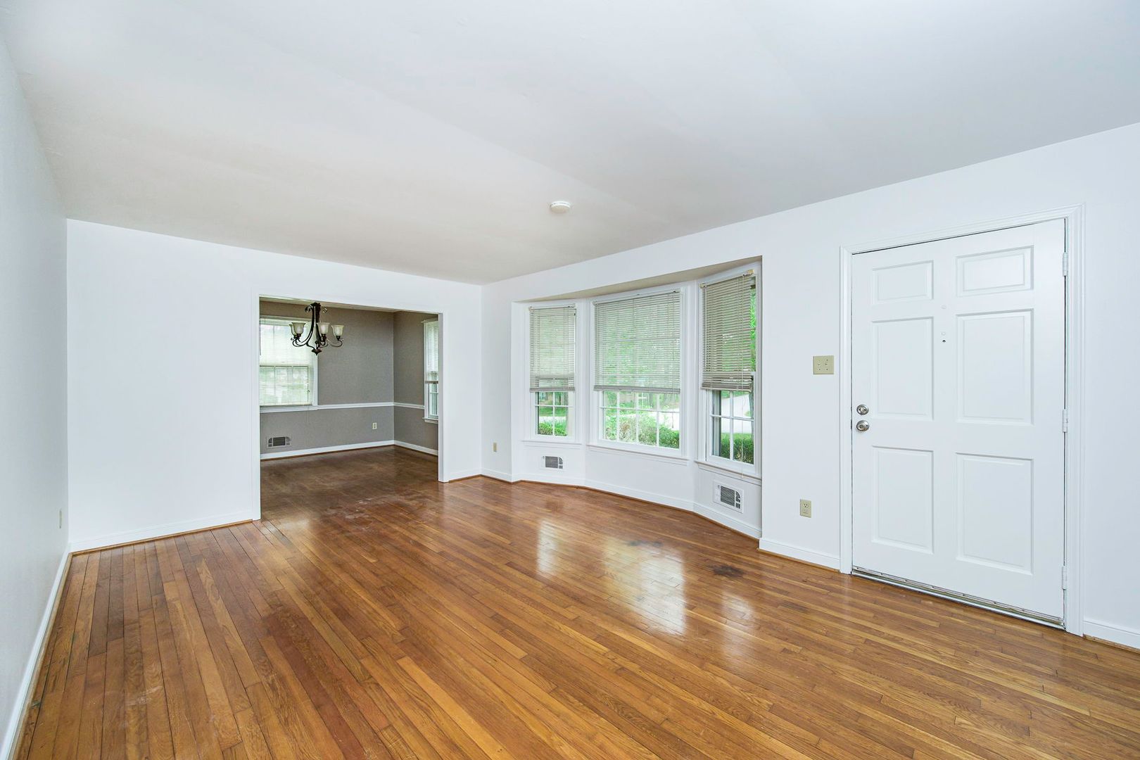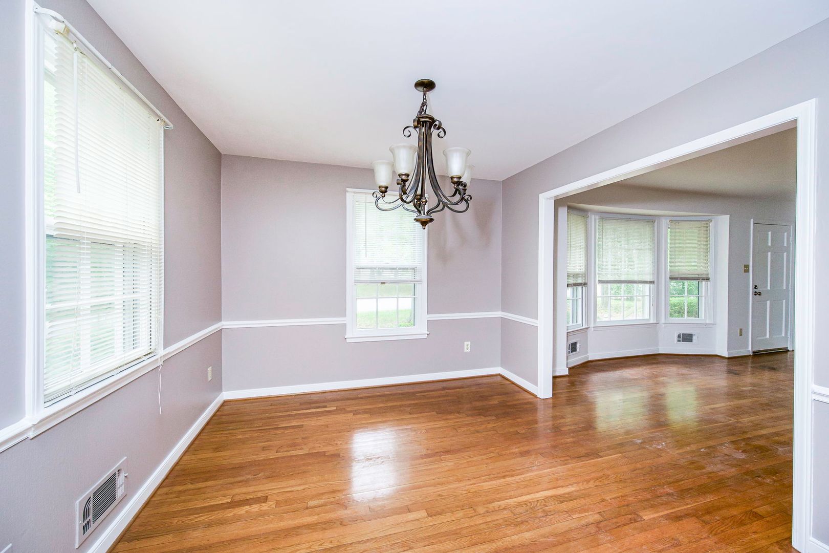 Step inside to find gleaming hardwood floors and an abundance of natural light flowing through large windows, including a bright bay window that creates a warm and inviting living area. The home features both a spacious living room and a separate dining room, complete with elegant chair rail molding and a stylish chandelier—perfect for everyday living and entertaining.