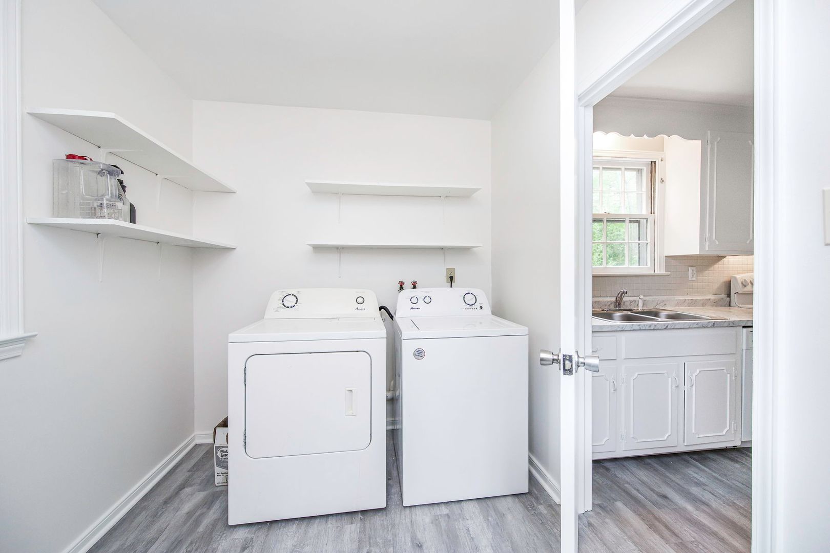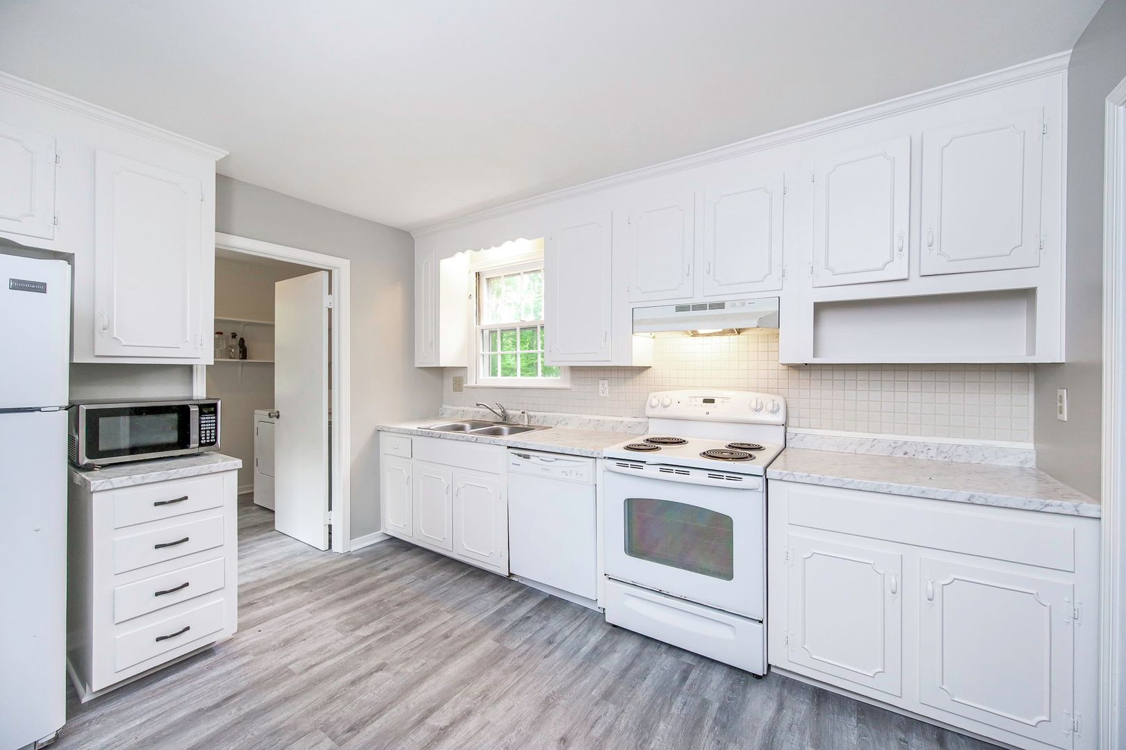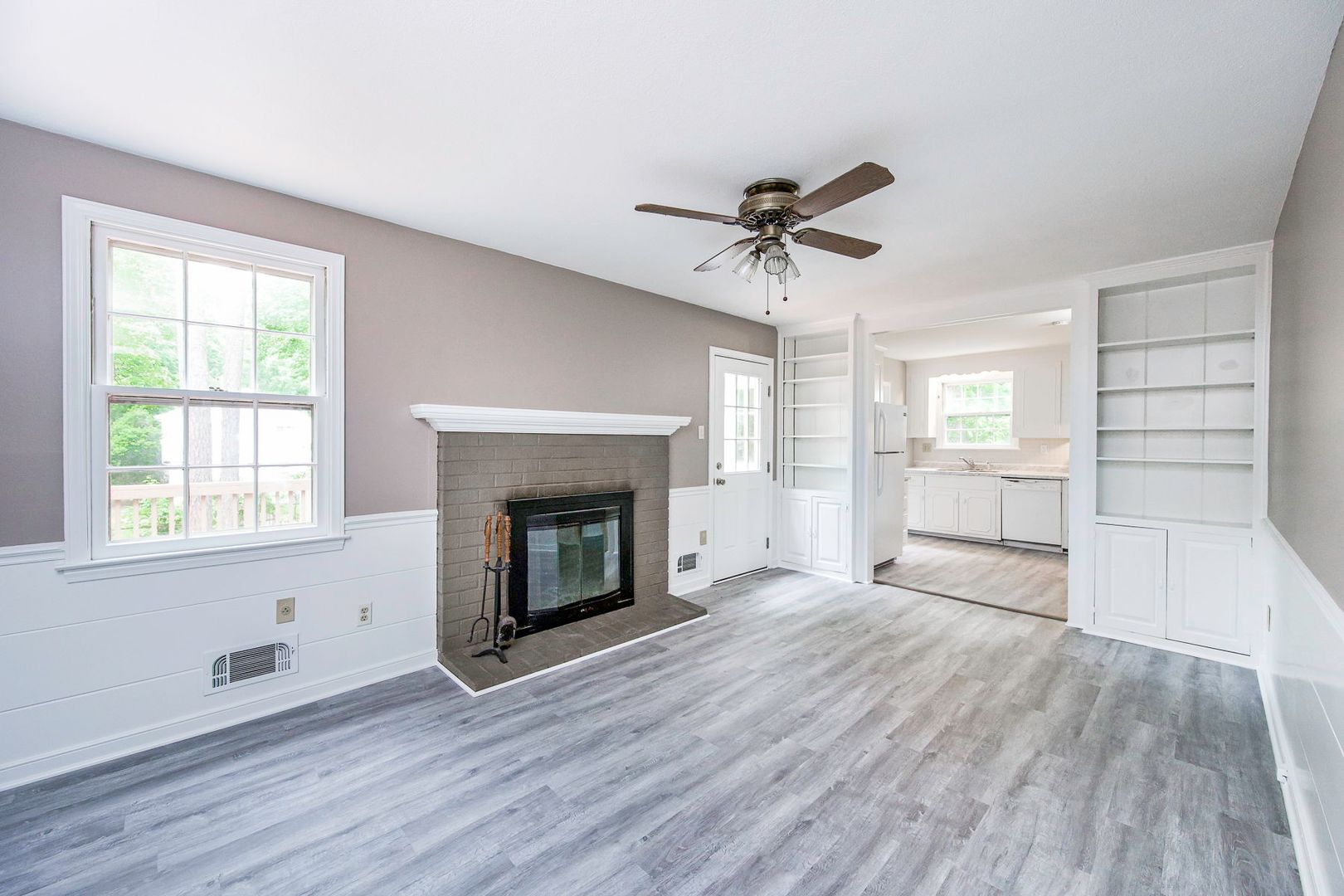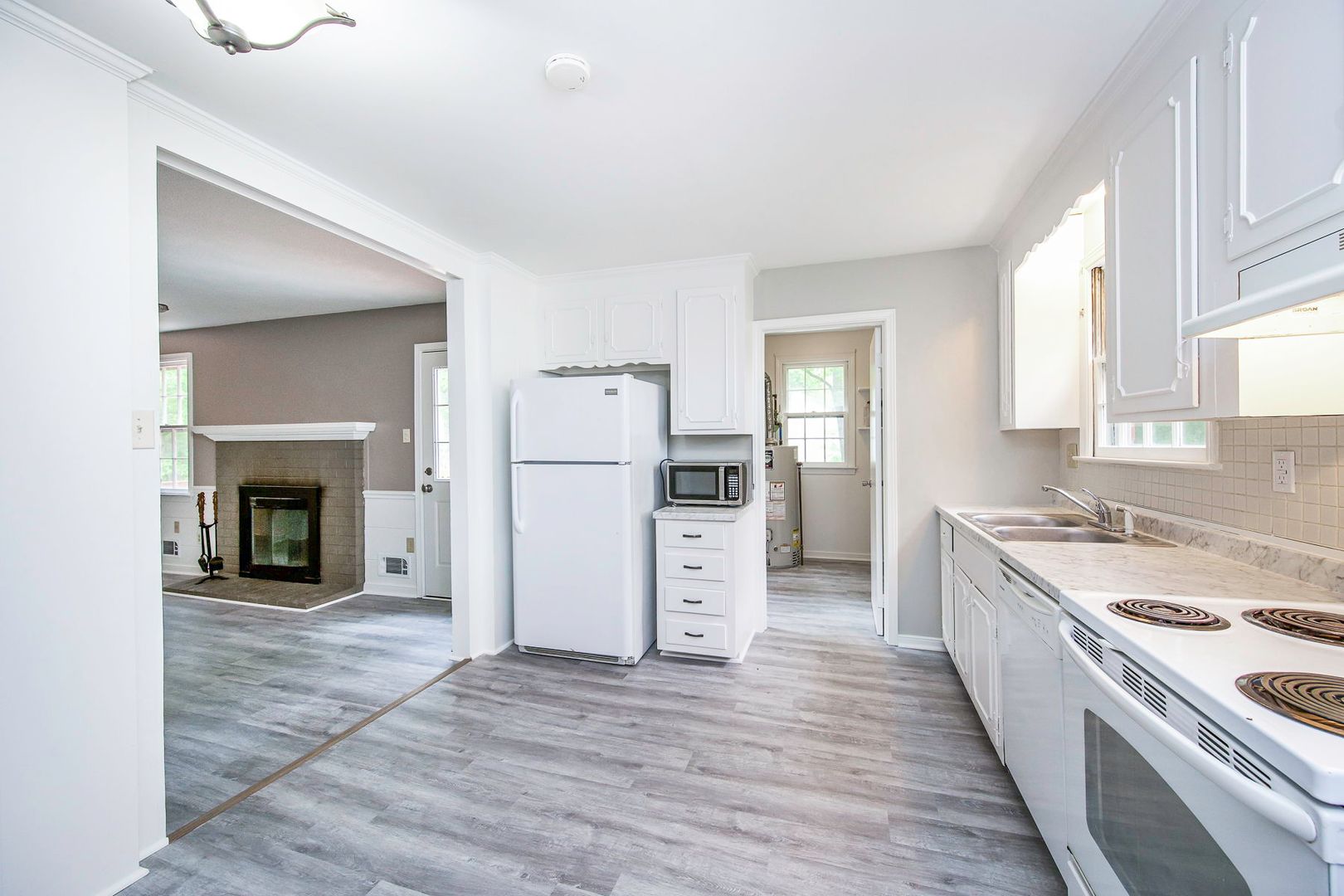 The kitchen offers ample cabinet and counter space, bright white cabinetry, and a functional layout that opens to additional living space. Just beyond, enjoy a cozy family room featuring updated flooring, a charming fireplace, and built-in shelving—ideal for relaxing evenings or hosting guests. A dedicated laundry/utility area adds convenience.